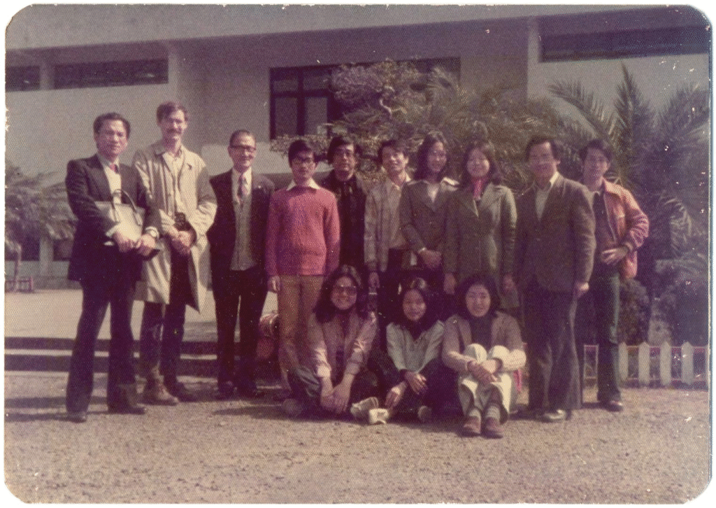 照片中有郭雨新先生(左三)、林義雄律師(左一)、林二先生(左五)、陳菊小姐(坐者左一),以及若干去旁聽的台大學生,站立者右四是我,拍攝者姚嘉文律師當然不在內。我記得是姚律師洗給大家的,難得中的難得。(攝於台灣高等法院台中分院門前庭園)