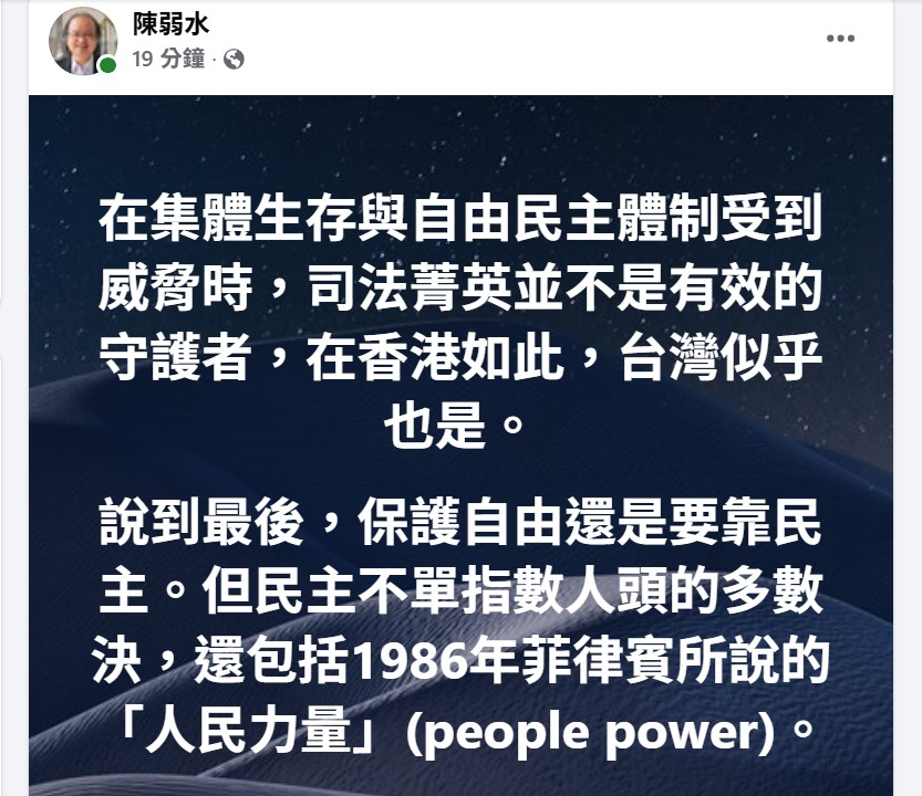 剛剛看到陳弱水的短箋文(見擷圖),決定也將我傍晚在一個有法律人的群組寫的文字迻錄到這裡,和大家分享,意思有點近似。群組文字沒時間好好琢磨,敬請諒解:
