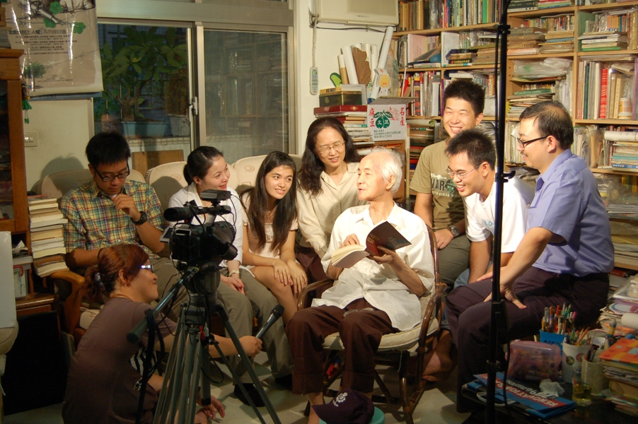 照片一:2009年8月12日拍紀錄片後,攝影師替我們拍的合照,感覺像劇照XD。當時的學生已經有三位在大學教書,兩位在高中教書,一位是自由翻譯者。左起:陳志豪、陳慧先、顏昀真、我、陳榮聲、林子超、查炘。中坐者:王世慶先生,左下坐者:拍攝團隊成員。(茱莉亞廣告傳播有限公司提供)